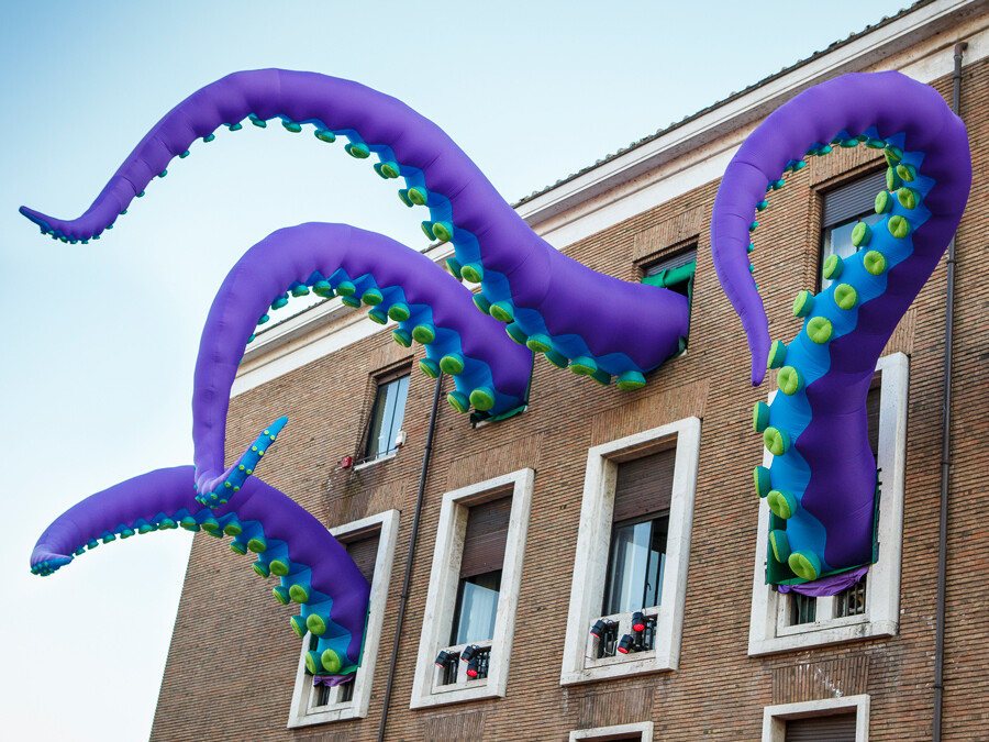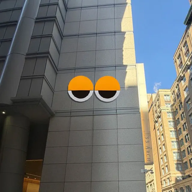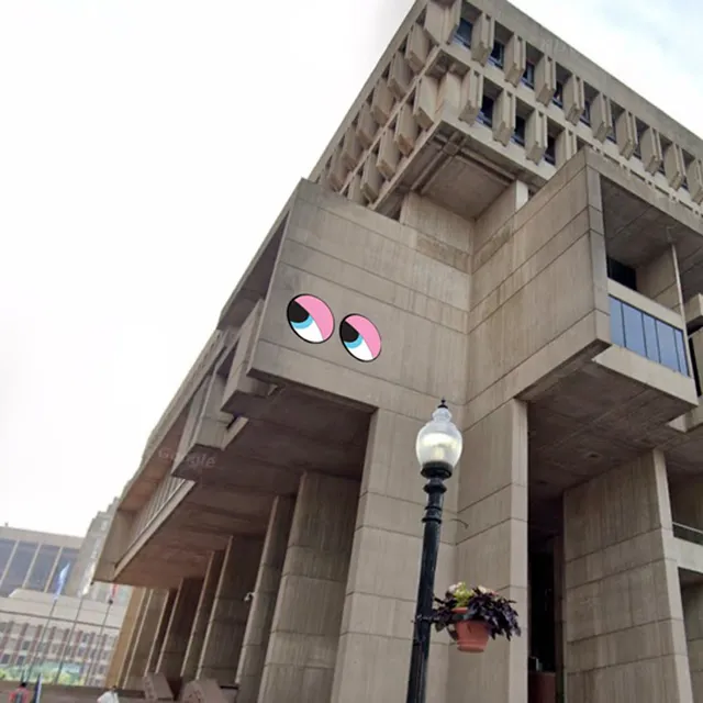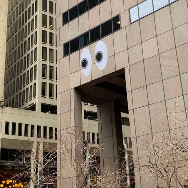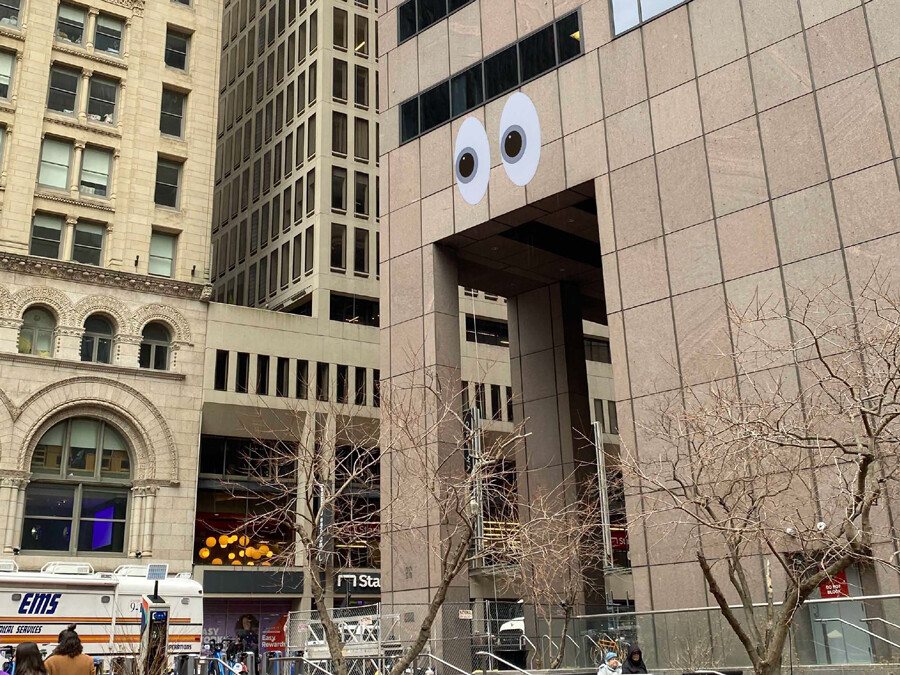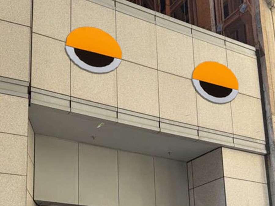 Several buildings seem alive with big googly eyes. These personified architectures challenge the viewer and direct their gaze, while giving them the unsettling impression of being watched by a Big Brother-like presence. This ostensibly benign yet oppressive form evokes our ambiguous relationship with social networks in the era of surveillance capitalism. While entertaining content and endless emoji give such digital platforms a veneer of harmlessness, they capture our personal data to feed industries bent on controlling our behaviour.
