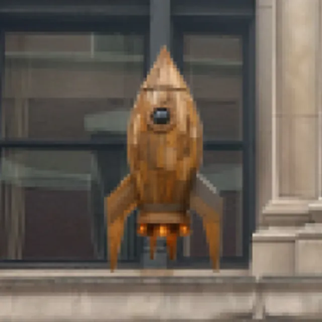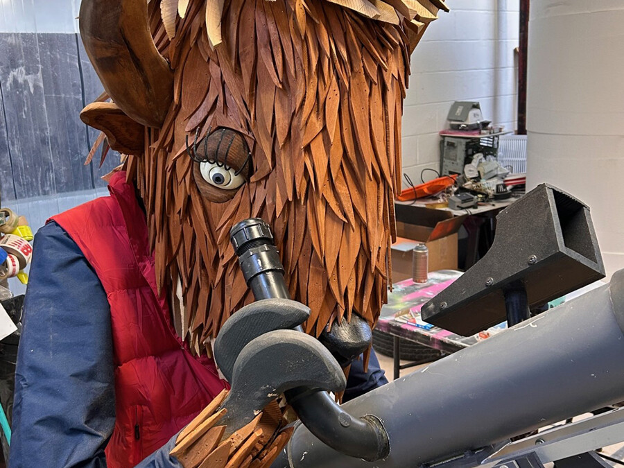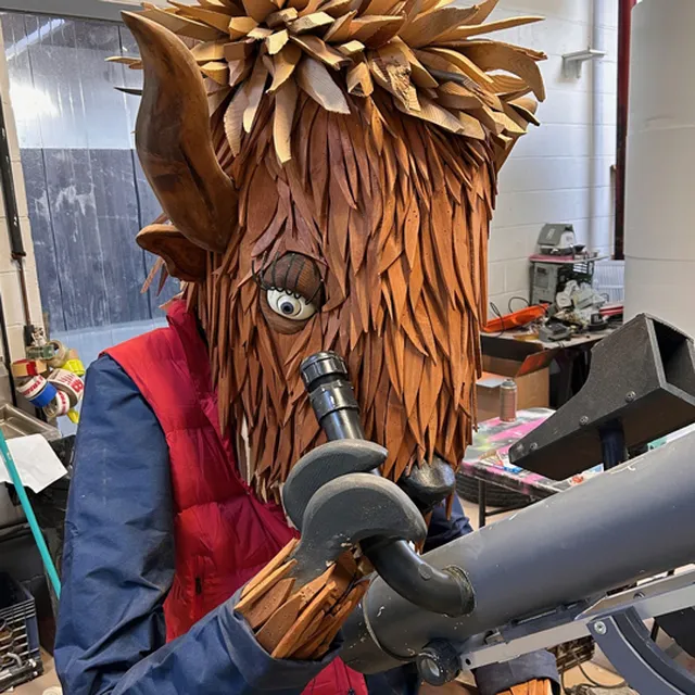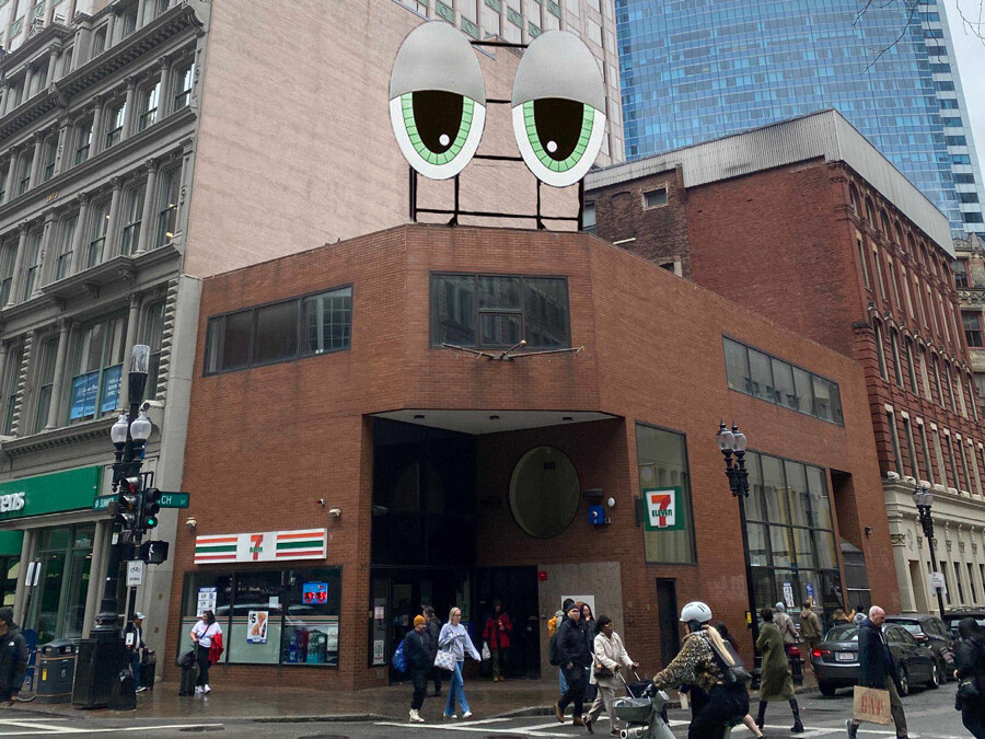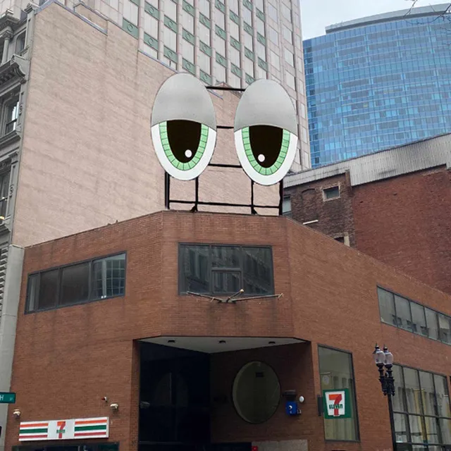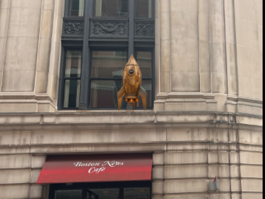 This installation transforms a retro camping trailer into a playful basecamp and site for discovery in Winthrop Square. From his rooftop perch, a wooden bison explorer peers through a telescope toward a massive rocket installed on a nearby rooftop, tying the square to Boston’s history as the site of America’s first recorded UFO sighting by John Winthrop in 1639.
