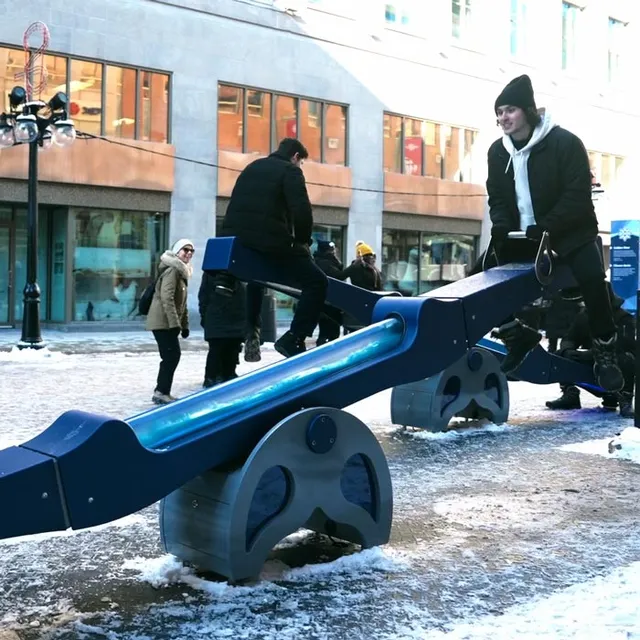 e/motion is a revisited version of our childhood see-saw that invites you to dive into the joys and sensations of surging water. As you ride this infinite wave, the glowing liquid acts like a living entity that responds to your ups and downs.