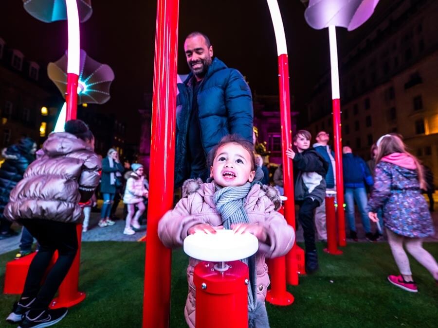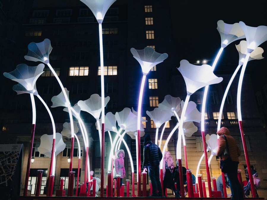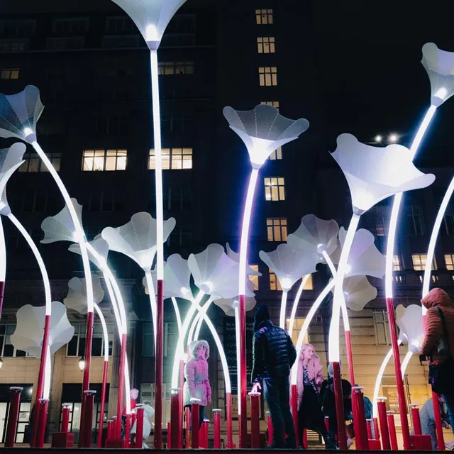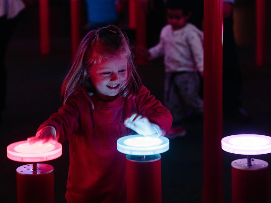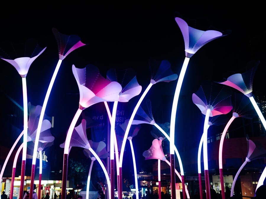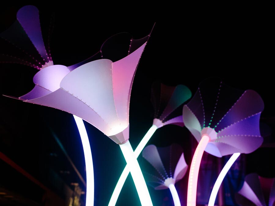 In approaching the towering Trumpet Flowers a sense of shrinking envelops you, as if stepping into a giant’s musical garden. As a vibrant jungle of light, colour, and sound bursts forth like a symphony of nature, meander and explore this floral forest and accept the invitation to activate your own spectacular light show accompanied by a curated musical score.