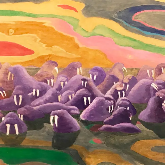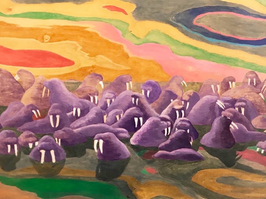 Walruses on the Rings of Saturn was originally created on a wood panel based on a photograph in National Geographic. Robert was inspired by the natural pattern of the wood to paint the sky and water with a combination of stain and acrylic paint. This work reimagines an earthly scene in the spectacular vibrant setting of Saturn’s rings.